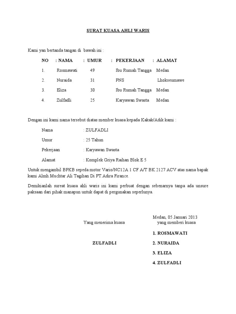 Penyerahan surat kuasa ahli waris kepada pemohon. Menghadap dan menghadiri sidang di pengadilan agama . Demikian surat keterangan ini kami berikan dengan sesungguhnya agar maklum. Proses penandatanganan oleh pejabat kelurahan;; Contoh surat kuasa ahli waris huruf, riwayat hidup, pra tk, cv kreatif,.