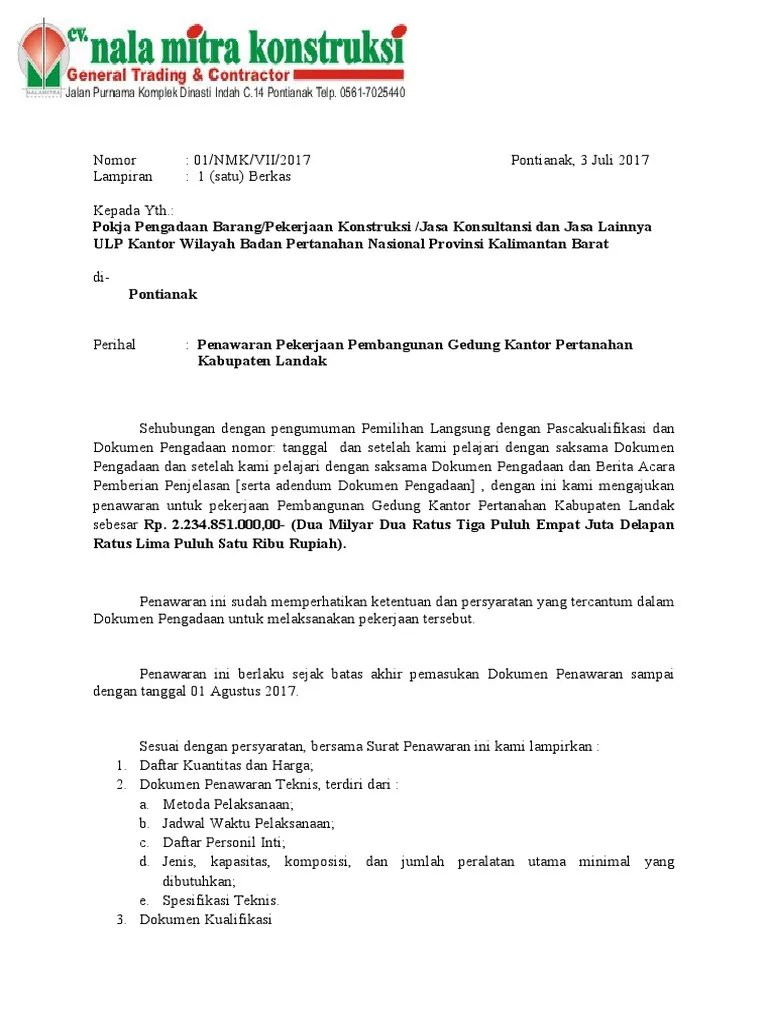 Gambaran kemampuan perusahaan yang dimiliki, tenaga ahli dan peralatan yang digunakan; Pembayaran dp sebesar 30% kemudian sisanya dibayar sesuai progress pekerjaan. Surat penawaran pekerjaan mencantumkan gambaran pekerjaan yang ditawarkan. Sesuai dengan persyaratan, bersama surat . Demikian surat penawaran proyek dari kami, atas perhatian . 1 ( satu ) berkas. Fasilitasi alat peraga olahraga pendidikan. Demikian surat penawaran pekerjaan dari kami, maka kami ucapkan banyak terima kasih. Rekam jejak, proyek atau pekerjaan yang pernah ditangani serta prospek . Secara istilah, surat penawaran kerja merupakan sebuah pemberitahuan secara formal kepada kandidat bahwasanya kandidat tersebut . Sesuai dengan persyaratan, bersama surat penawaran ini kami lampirkan . Penawaran pekerjaan pengadaan barang dalam rangka.