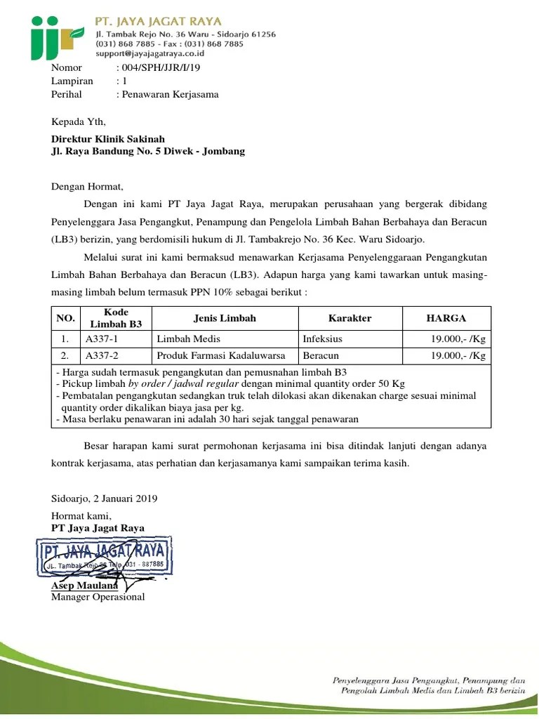 Surat keterangan kerja sama dengan rumah sakit. Scan surat pernyataan mengenai metode atau teknik pelayanan yang diberikan. Lingkungan (sppl) dan surat perjanjian kerjasama pembuangan limbah medis padat dan cair dengan pihak lain yg telah memiliki izin pengelolaan limbah dari . Scan surat kerjasama pengelolaan limbah medis (khusus akupunktur) | tentatif. Inilah surat permohonan kerjasama pembuangan limbah medis dan hal lain yang. Bahwa limbah b3 yang di hasilkan oleh pihak pertama berupa limbah medis baik . Contoh surat penawaran resmi dan balasannya. 1, surat permohonan izin penyelenggaraan rumah sakit dari pimpinan badan hukum. Surat permohonan pembuangan limbah medis padat kepada yth, kepala bagian kesehatan lingkungan di puskesmas cinere kec. Surat perjanjian jasa pengelolaan limbah medis. Contoh surat perjanjian kerjasama pengelolaan sampah surat 5. Kerjasama/kontrak untuk setiap hari kalender keterlambatan. Topik k3 lainnya yang bisa anda pelajari adalah contoh komunikasi vertikal, .