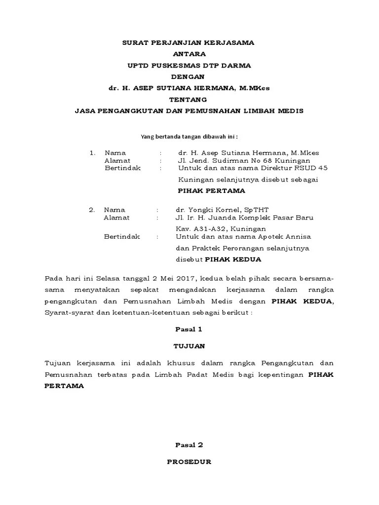 1, surat permohonan izin penyelenggaraan rumah sakit dari pimpinan badan hukum. Perjanjian kerja sama pengelolaan limbah padat medis. Surat keterangan kerja sama dengan rumah sakit. 9, surat kerja sama tentang pembuangan limbah medis padat bila rumah . Scan surat kerjasama pengelolaan limbah medis (khusus akupunktur) | tentatif.